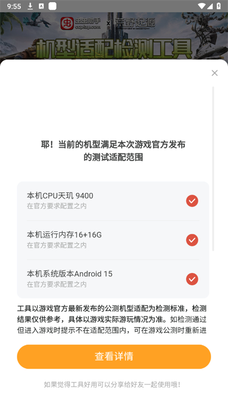 3)精准结果:软件拥有庞大的数据库,涵盖了市面上众多手机型号和系统版本的信息,通过与荒野起源游戏的适配要求进行对比分析,能够给出精确的检测结果,让玩家清楚了解自己的手机是否能够流畅运行游戏。