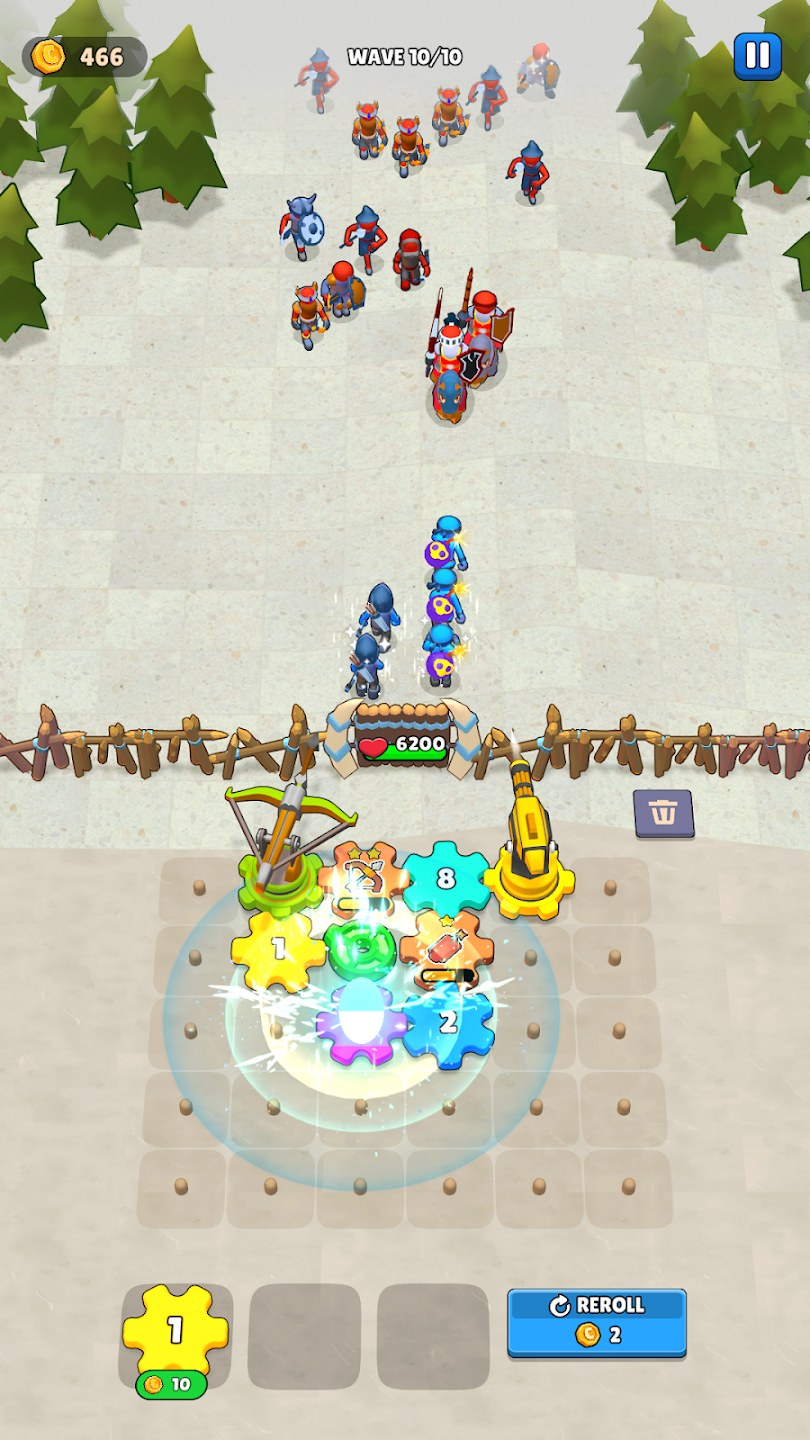 2、通过连接齿轮驱动士兵,齿轮旋转后能产出士兵和释放法术等效果,就能形成对推式塔防抵御持续进攻的敌人。